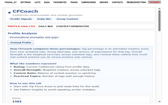 Profilanalysen ger insikter om styrkor, svagheter och mönster i prestation, medan Daglig Mix rekommenderar problem som alltid är redo för praktik. Tävling Generatorn skapar balanserade problemset för både individuellt och gruppträning. CFCoach är utformat för tävlingsprogrammerare som strävar efter en mer disciplinär och datadriven träning och snabbare förbättring, allt direkt på Codeforces profil sidor.